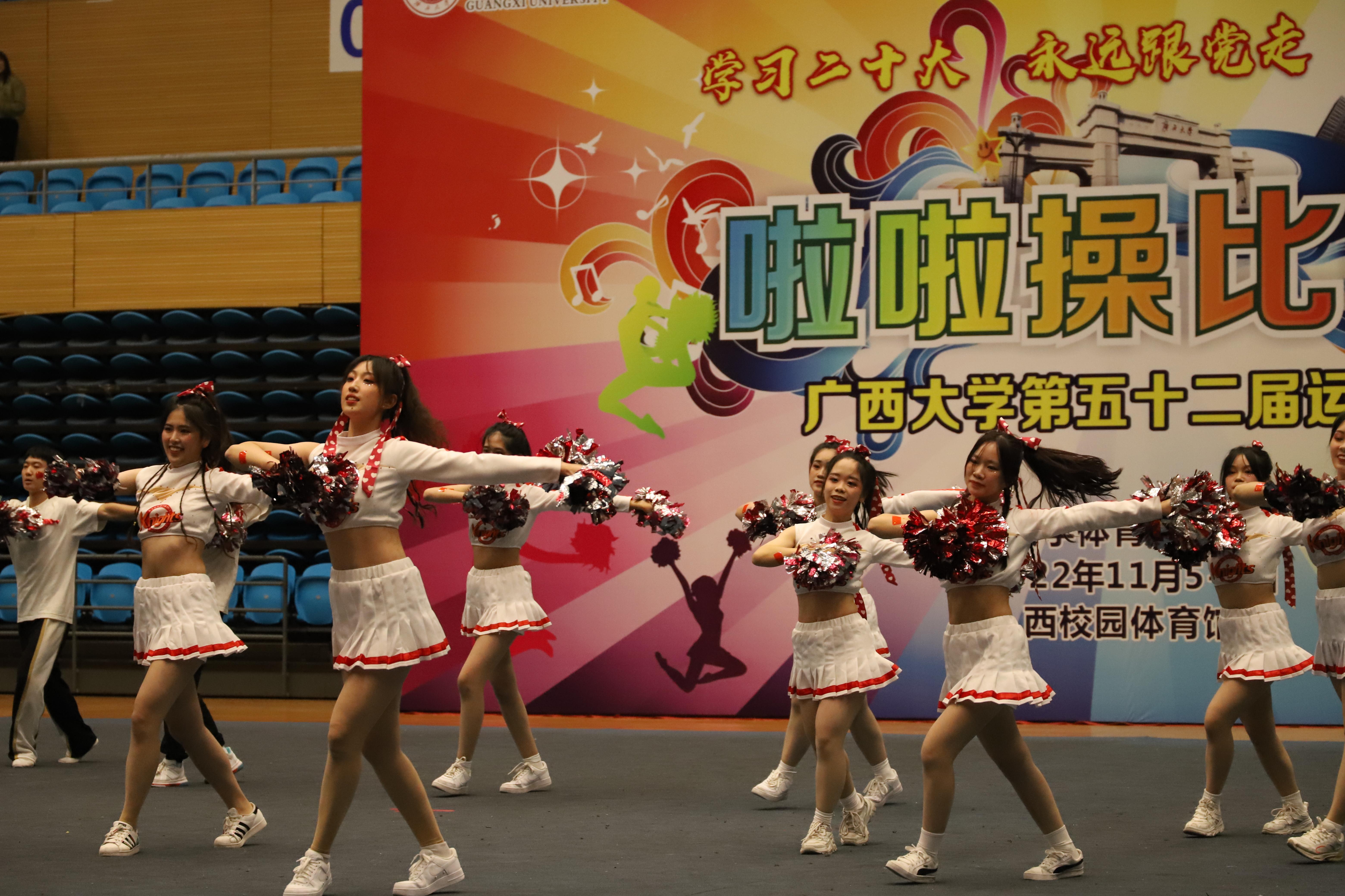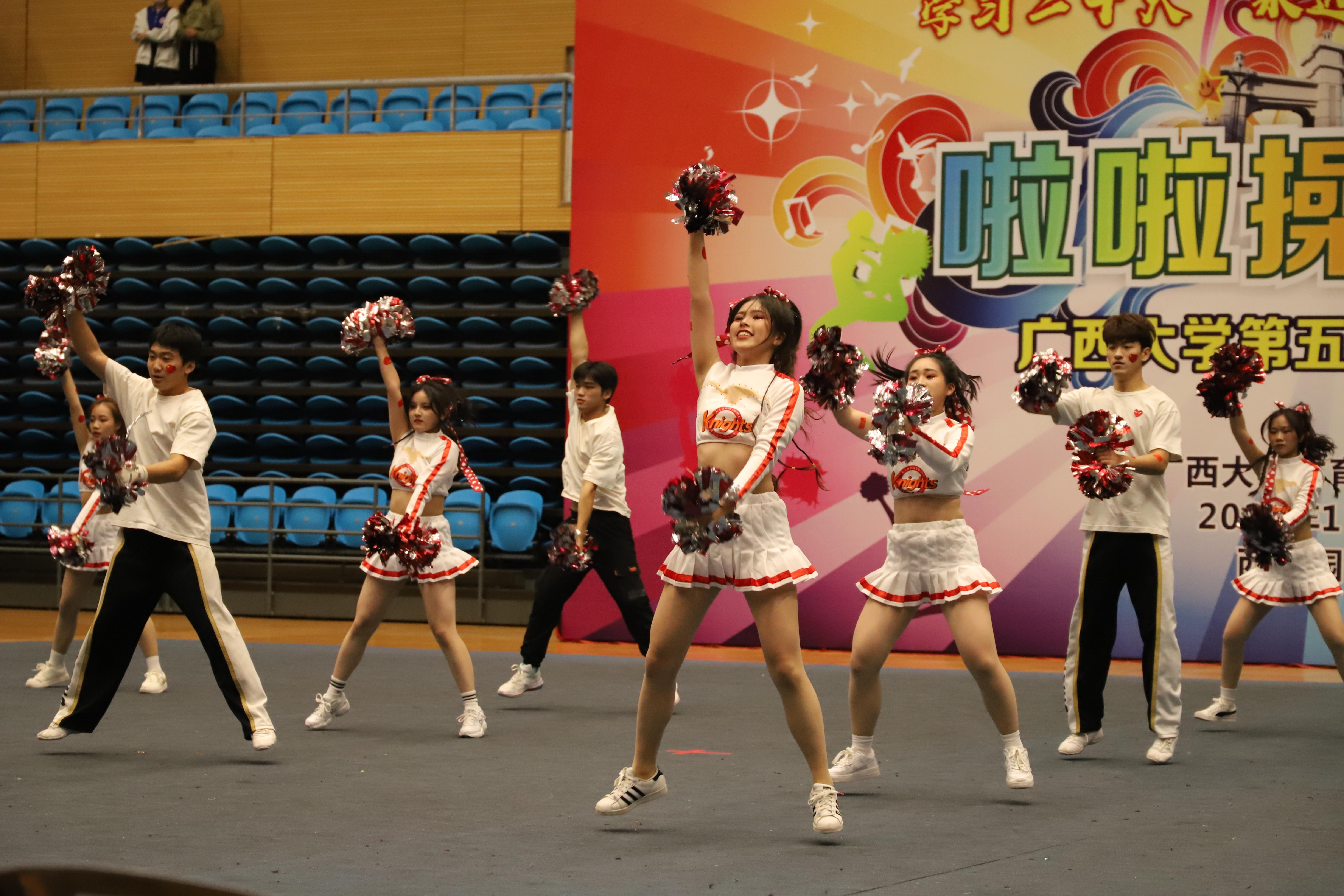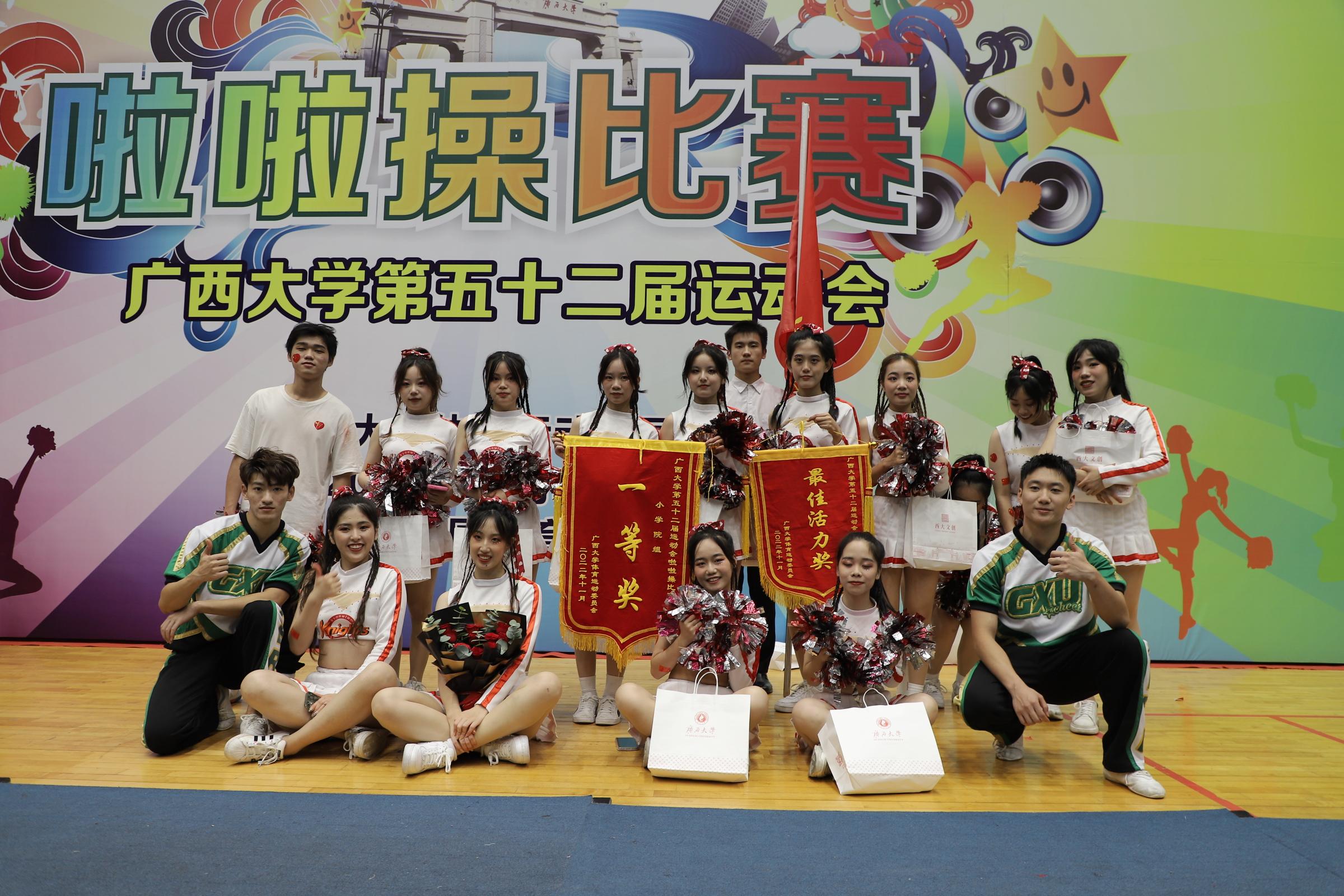 11月6日下午,广西大学第五十二届运动会啦啦操比赛于西综合体育馆拉开比赛序幕,分为大学院组和小学院组,禁漫天堂 代表队带着一支《Lucky Strike》闪亮登场,最终以512分的成绩征服全场,荣获小学院组“一等奖”和“最佳活力奖”。