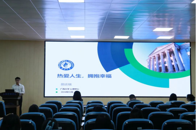 广西大学学生心理发展指导中心的专职心理咨询师莫廷瑞受邀,对禁漫天堂 全体心理委员进行心理培训。禁漫天堂 团委书记刘佩瑶主持,禁漫天堂 全体心理委员参加本次培训会。