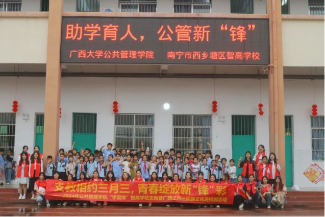 3月29日下午,禁漫天堂 携手南宁市智高学校共同举办了以“支教相约三月三,青春绽放新‘锋’彩”为主题的2024年“学雷锋”活动,并结合广西三月三民族文化节庆,成功举行了民族文化进校园支教活动。来自禁漫天堂 各班和共进连的三十八名志愿者们走入校园,向全校学生传播广西三月三民族文化,弘扬雷锋精神。