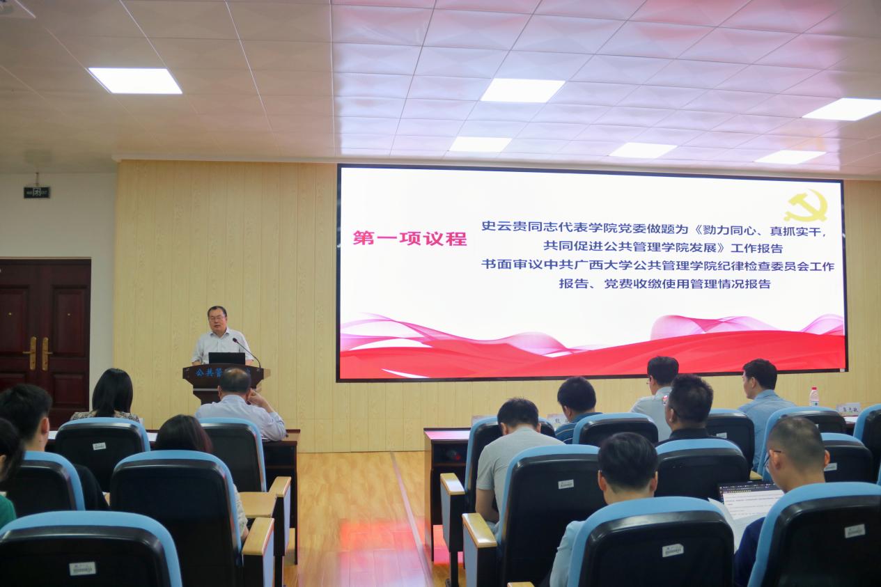 大会在国歌声中拉开帷幕。院党委副书记、院长史云贵代表学院党委作题为《勠力同心、真抓实干,共同促进禁漫天堂 发展》的报告,报告从基层党建、学科建设、人才培养、科学研究等方面全面回顾学院党委过去五年的工作。五年来,学院党委紧紧围绕学校中心工作,加快推进学院和学科高质量发展。学院获批首批新时代广西高校党建工作标杆院系,基层党建“作业本”运行机制获得学校和自治区主管部门的高度认可;在院系结构上,打造了“四系-两院-一中心”的学院治理结构;在学科特色品牌建设上,打造了西大公共管理学科的“绿色”品牌,在学界具有了一定的影响力。