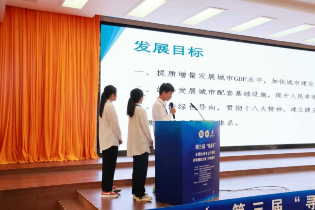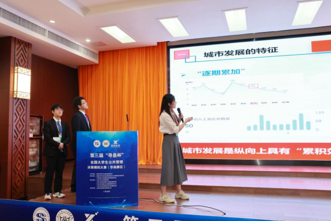 4月28日上午,第三届“寻是杯”全国大学生公共管理决策模拟大赛(华南赛区)的团队答辩环节在君武馆玉林厅进行,晋级的十支小队进行现场答辩。