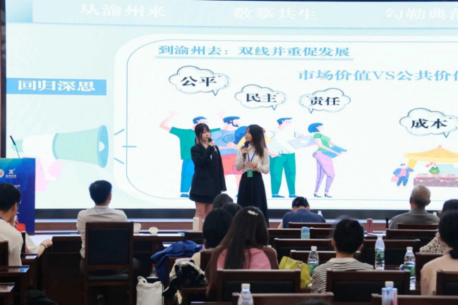 在答辩环节,各参赛队采用多样化的表现形式——用视频做辅助,搭建情景剧剧场等形式进行展示汇报。在对沙盘模拟经营回顾时,参赛小组结合沙盘模拟经营的角色,对公共治理的实例进行切入展开、剖析、总结,探讨出公共治理的应用实景。参赛小组提出“文化供给侧结构性改革” “科技赋能” “异质文化融合” “情感活化” 等公共治理的观点,在解释和分析公共案例中,深化了对公共问题、公共治理的认知与实践理解,做到理论与实际相结合,学以致用。