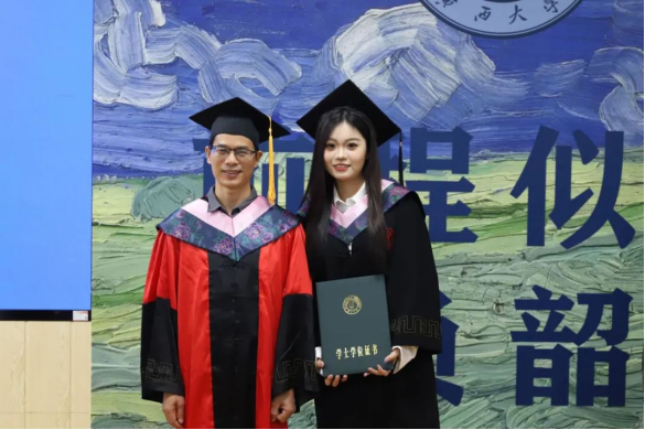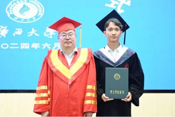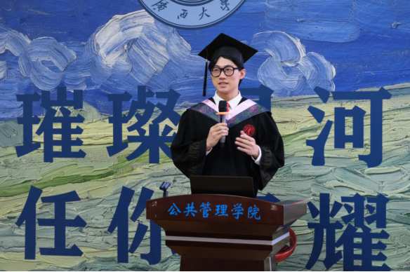 罗友渔作为本科生毕业生代表,回顾了过去在逆境中磨砺出的坚韧与成长,展现了公管人不屈不挠的精神和追求卓越的决心。罗友渔鼓励所有毕业生共同建设公管,建设西大,肩负起建设世界一流大学、满足社会需求的重任。