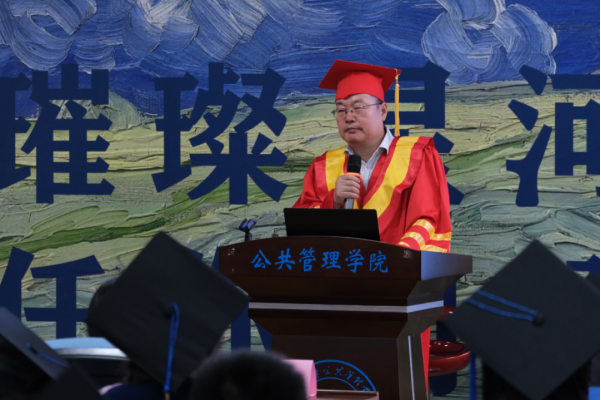 教师代表陈璟浩向即将毕业的公管学子做出希望:适应角色变化,拥抱变化。毕业是大学学习的终点,也是新生活、新征程的起点,即使生活和工作面临新的角色和挑战,也要勇于接受变化、善于适应变化、乐于拥抱变化,让人生在发展道路上精彩丰富;勇敢面对挑战,不惧困难。无论遇到什么困难,都勇敢面对,不断奋起,百折不挠地追逐人生理想,书写人生华章。