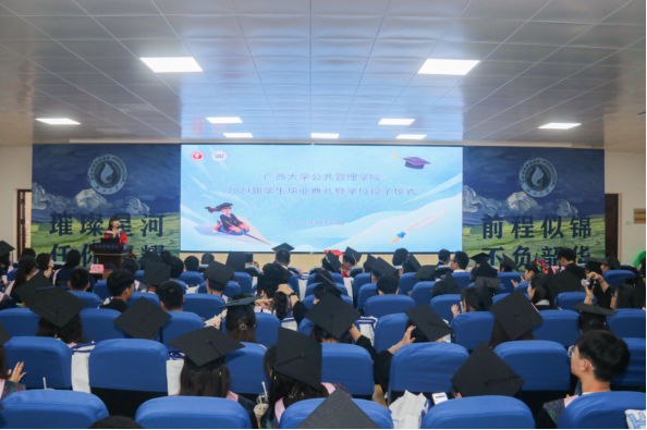 进入学位授予仪式环节,覃志敏宣读学位授予决定后,本科生、学术型硕士及博士生毕业生按顺序依次上台接受学位授予。院学位委员会成员为获得学位的毕业生行拨穗礼并授予学位证书、合影留念,毕业班班主任、辅导员老师为每一位毕业生送上忠诚祝福。