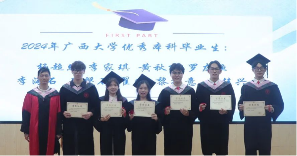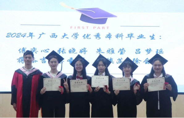 周均旭、曾凡军、覃志敏上台给优秀毕业生依次颁发荣誉戒指及证书,是对毕业生们辛勤付出的肯定与认可,也是对他们未来征程的祝福与希望。