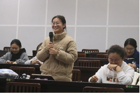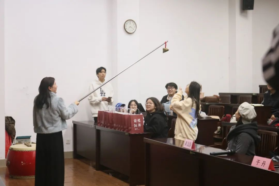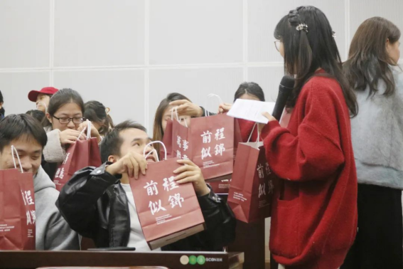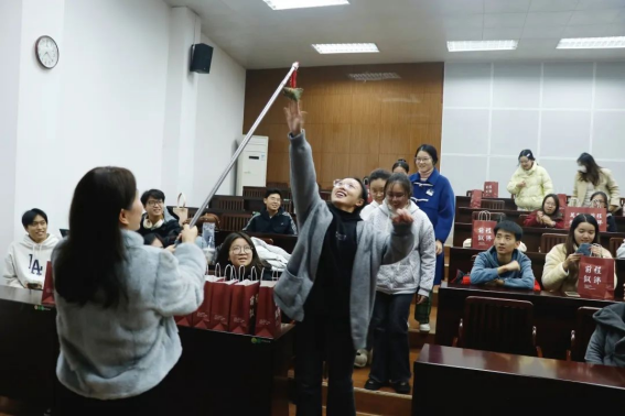 “击鼓传花”小游戏给考研学子放松解压,鼓声停时,拿到公管文创公仔“小管”的同学起身,表达备考心情,送出考研祝福,鼓励彼此携手共进,共同“上岸”。