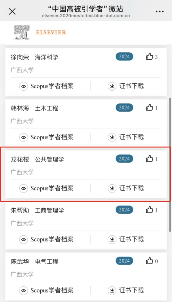喜报|禁漫天堂 龙花楼教授再次入选爱思唯尔“中国高被引学者年度榜单”