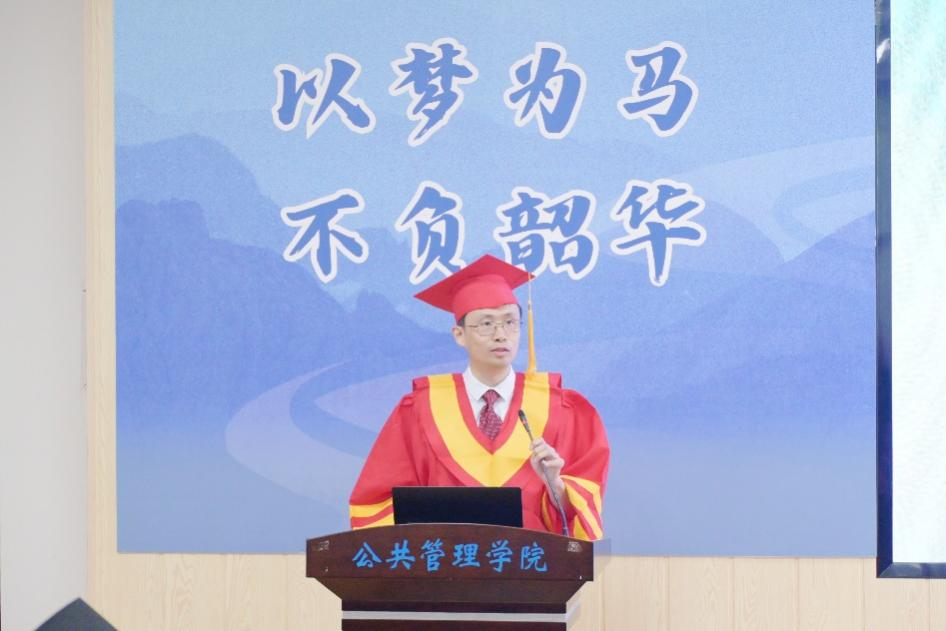 聂鑫代表学院向194名顺利完成学业的MPA学员表示热烈祝贺,他结合生动事例,对同学们克服工学矛盾、顺利完成学业表示高度理解和赞赏。同时,他对毕业生指出三点期望:一是要知行合一,做公共管理精神的坚定实践者;二是要洞悉现实,练就分析复杂公共治理难题的硬功夫;三是要坚守初心,做公共管理的忠实守护者。最后,聂鑫向全体毕业生致以殷切嘱托和美好祝愿。