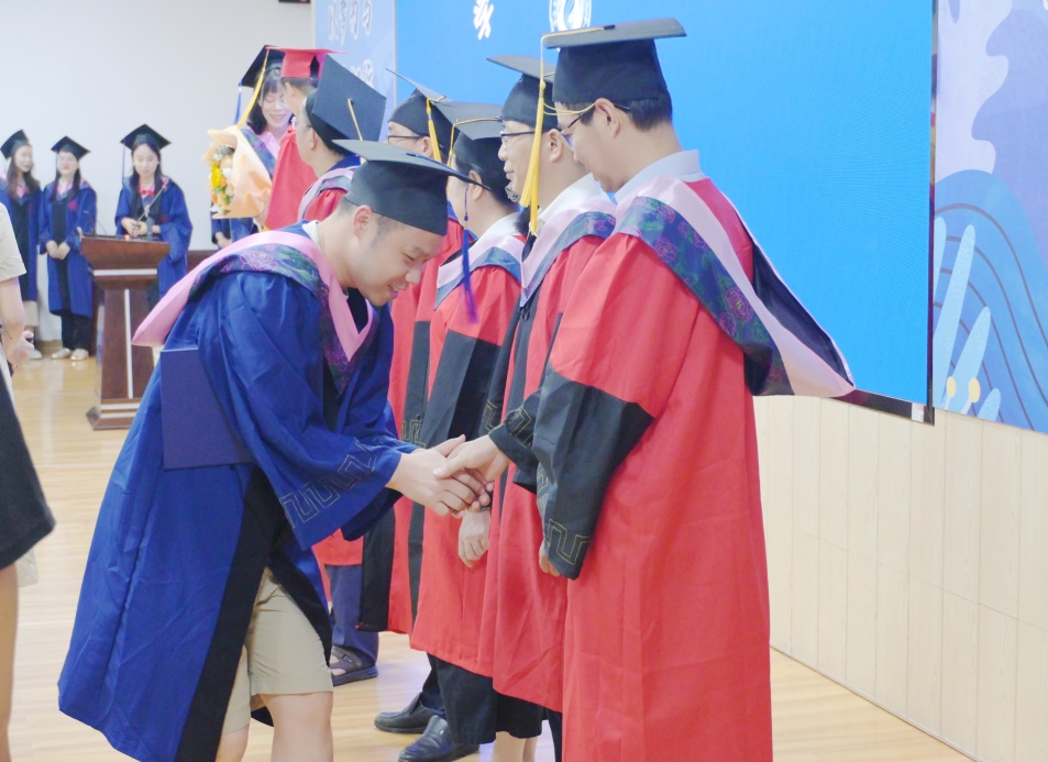 学位授予环节,副院长周均旭宣读学位授予决定,现场为优秀毕业生及荣获优秀学位论文的同学颁发荣誉证书,并与他们合影留念。随后,在礼乐声中,毕业生们依次有序走上台,院党委书记聂鑫亲自为每位毕业生行拨穗礼,并逐一与大家合影记录这一珍贵时刻。