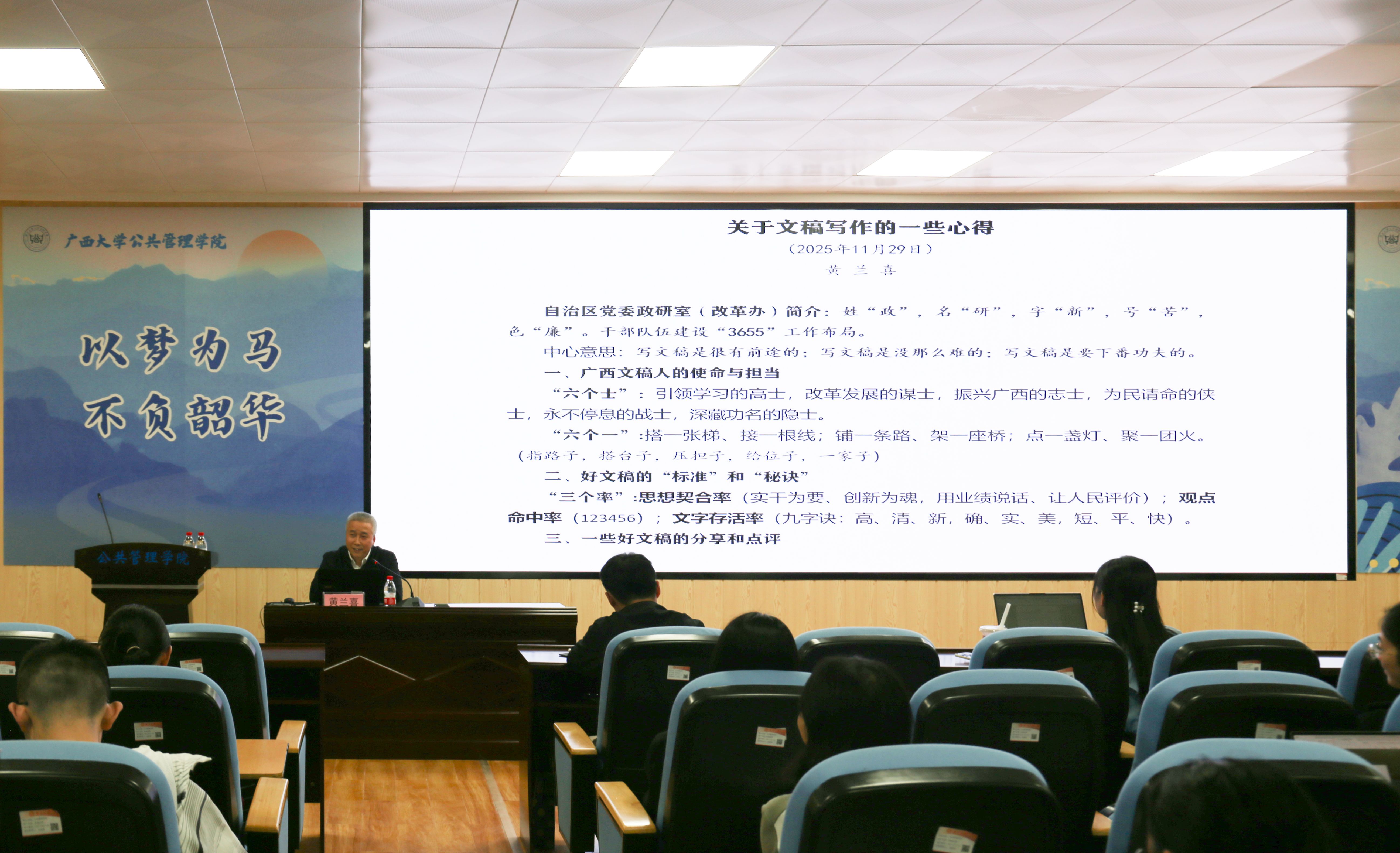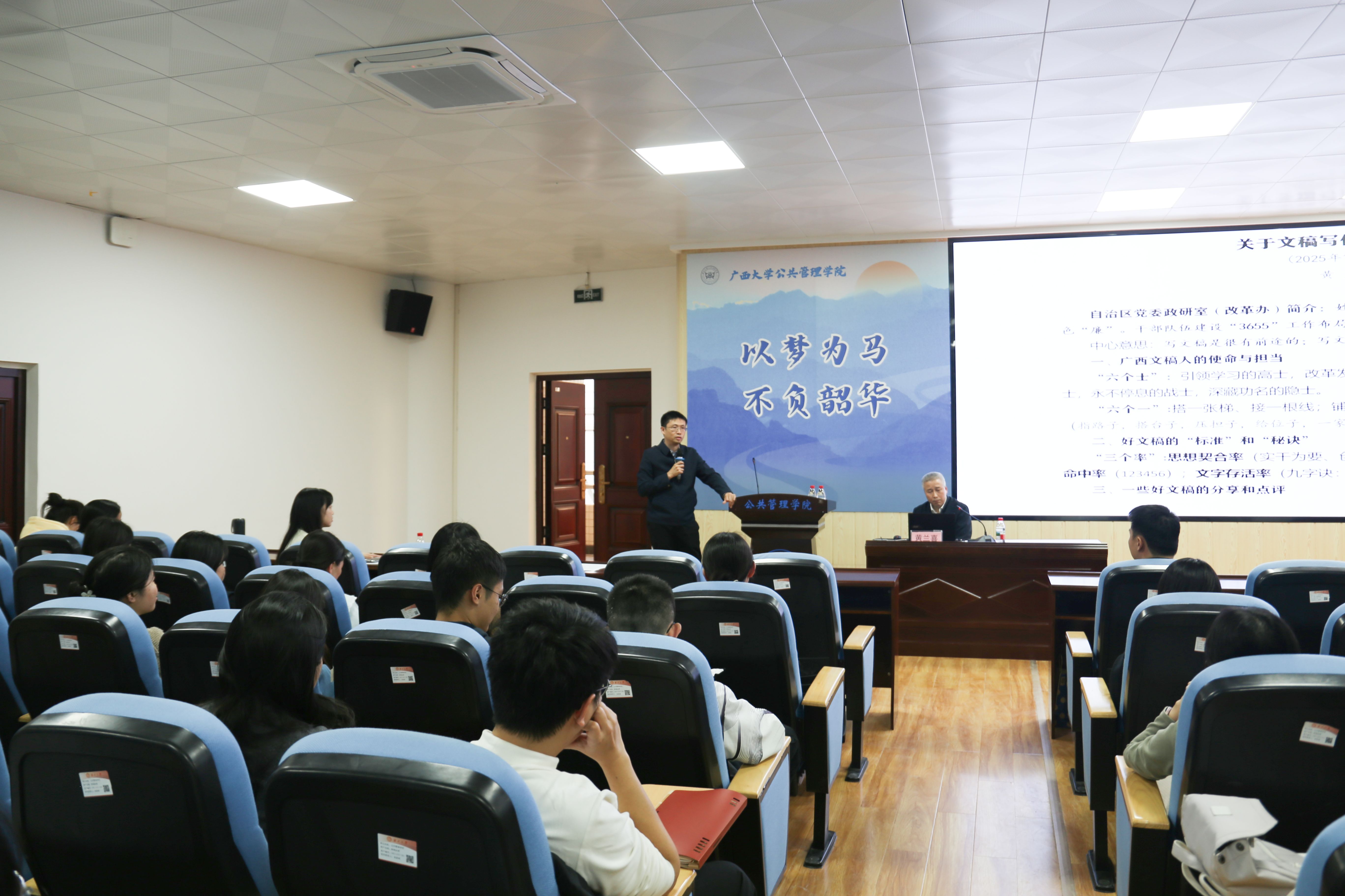 首先,黄兰喜强调了文稿写作的重要性。他指出文稿写作是机关干部乃至各行各业从业者的核心能力之一,并以身边真实案例说明不少青年干部正是凭借扎实的写作功底,逐步成长为业务骨干甚至走上领导岗位的,以此鼓励同学们重视写作能力的培养。