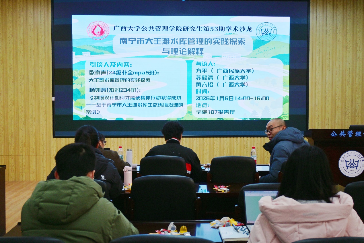 2026年1月6日下午,禁漫天堂 暨广西高校人文社会科学重点研究基地——区域社会治理创新研究中心第五十三期学术沙龙在学院107报告厅成功举行。本期沙龙聚焦“南宁市大王滩水库管理的实践探索与理论解释”主题,由24级非全日制硕士研究生欧家声、23级本科生杨如意担任引谈人,方平、苏毅清、黄六招三位老师担任与谈人。讲座深化了师生对相关领域的研究认知,吸引了全院众多师生参与。
