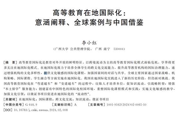李小红.高等教育在地国际化:意涵阐释、全球案例与中国借鉴[J].西北师大学报(社会科版),2024,61(02):65-74.DOI:10.16783/j.cnki.nwnus.2024.02.008.