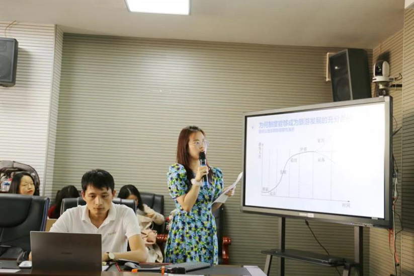 李睿同学分享的文章是基于QCA方法探讨制度对乡村旅游发展的影响。首先,她介绍了何为乡村旅游,继而引出在新时期、新形势下,我国乡村旅游发展进入2.0阶段,面临的问题是乡村旅游的可持续发展,探究何种因素会影响乡村旅游的发展。其次,她从文献综述展开,探讨影响乡村旅游发展的影响因素,即先天因素和后天因素。其中制度是先天和后天相结合的产物,产生于内部,由内部成员共同遵守,但却在外部但特殊条件下形成政治、经济、文化等方面的体系。文章着重从制度方面探讨其对乡村旅游的影响。文章基于制度分析与发展(IAD)框架进行了QCA分析,并进行了变量选择和阈值确定和校对方法。QCA全称Qualitative Comparative Analysis,定性比较研究方法,是20世纪80年代在社会科学研究中产生的一种针对中小样本(Small-N)案例研究的分析方法。IAD框架结构化地组织存在于各种制度安排中的主要变量。制度分析者认为,任何具体的行动情景的结构由三组外部变量所决定,包括其中组态包括了自然地理特征、经济社会属性、通用制度规则。文章基于QCA的分析结果,探讨了为何制度能够成为旅游发展的充分条件。最后,在经过系统分析后,李睿同学指出文章认为不同的要素组合作为多重动力能够促进乡村旅游的发展,其中制度起到关键性作用。