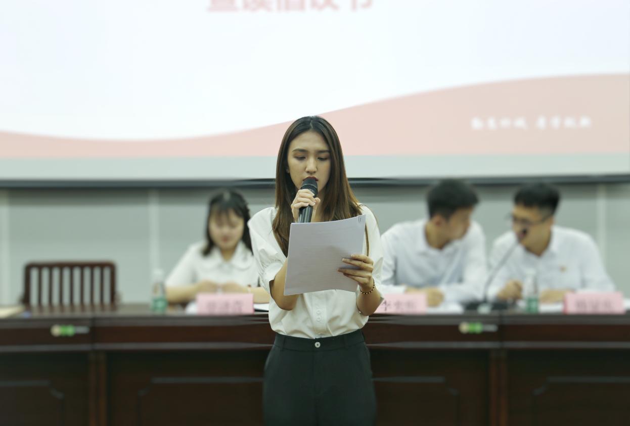 新任主席团成员代表粟钰清宣读倡议书,向禁漫天堂 研究生发出倡议:一是要志存高远,厚植家国情怀;二是要明德至善,锤炼坚毅品格;三是要勤学求知,增强创新意识;四是要奋发有为,砥砺使命担当。